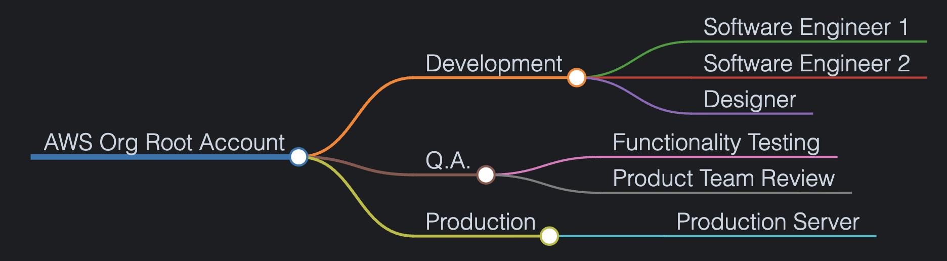 Exciting stuff right? Before you just dive in and start building stuff, you should think about what your development environment is going to look like. How will the engineering team make changes without affecting the production environment? How will code be tested and reviewed? A really nice way to handle this on AWS is to enable AWS organizations and then create separate accounts for each environment. Here’s a simple layout with three engineering accounts, a couple of Q.A. accounts and a single production account: